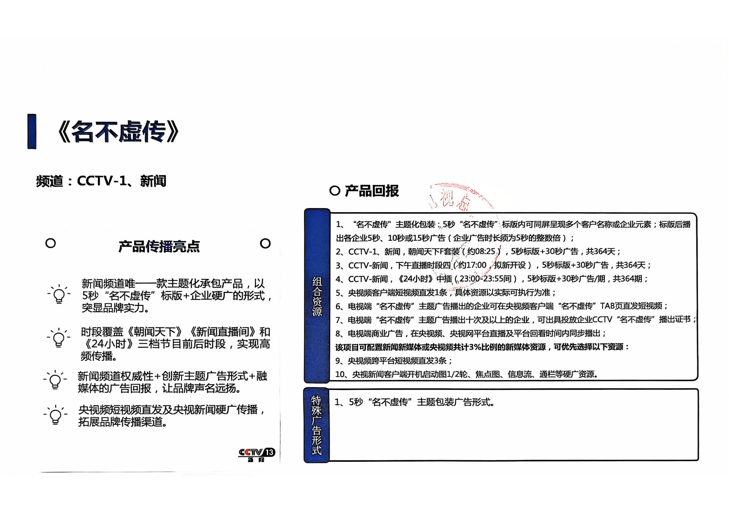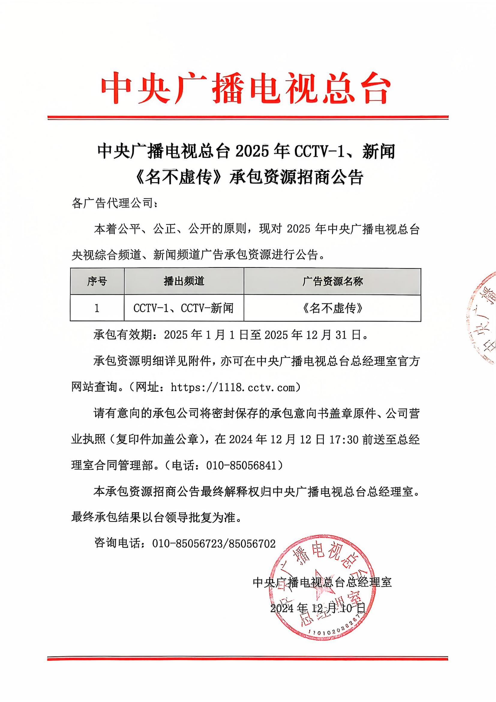2025年CCTV-1、新闻《名不虚传》承包资源招商公告