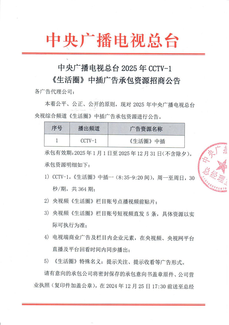2025年CCTV-1《生活圈》中插广告承包资源招商公告