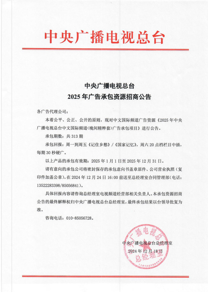 发布时间: 2024年12月24日 10:47 | 来源: 中央广电总台总经理室 |